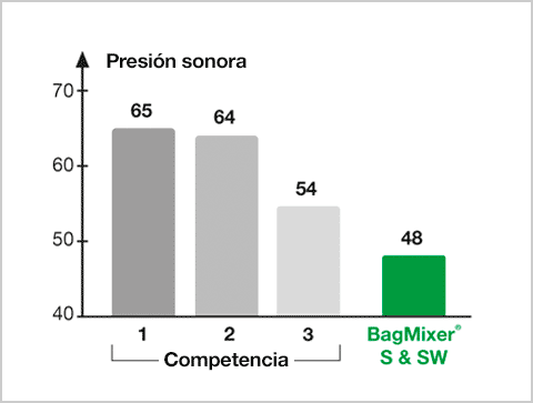 Los homogeneizadores clásicos son ruidosos y pueden resultar agotadores a los usuarios del laboratorio. BagMixer SW está equipado con una cámara de reducción acústica y una puerta de doble acristalamiento, las cuales garantizan un ambiente de trabajo agradable. El sonido producido es inferior a 48 dB, mucho menor a los 54 dB del competidor más cercano (prueba acústica ISO 3744).