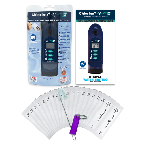 El Clorine eXact EZ certificado por NSF / ANSI 50 L1, utiliza nuestras tiras patentadas eXact® y mide 9 parámetros importantes de calidad del agua. Cuenta con un sistema reactivo rápido y fácil para el análisis.