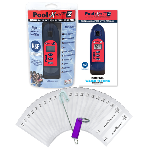 El fotómetro de piscina eXact® EZ certificado por NSF / ANSI 50 L1, ofrece 10 parámetros de agua de piscina con resultados de calidad de laboratorio. La mayoría de las pruebas con el fotómetro Pool eXact® EZ utilizan tiras patentadas eXact®, un sistema de reactivo rápido y fácil para el análisis.